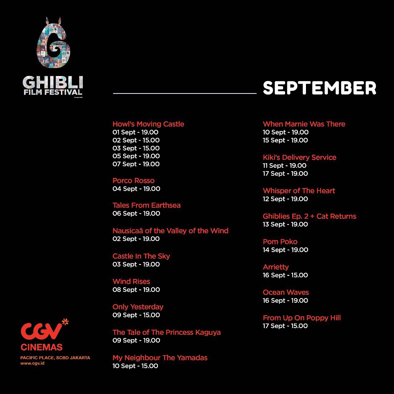 Tapi di akhir Agustus ada info di Twitter bahwa di CGV Pacific Place Ghibli Film Festival dan jadwal nya Film Howl yg tayang duluan.